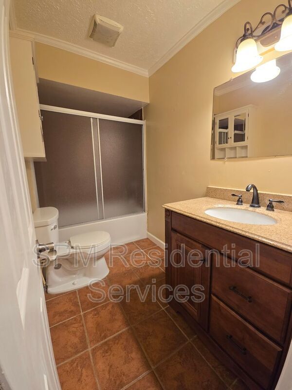 - Bathroom with tile floor, granite vanity, and tub/shower combo